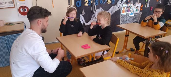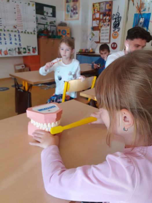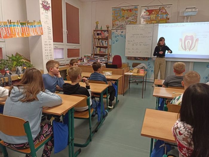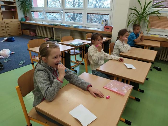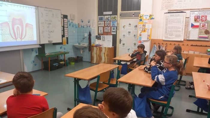 Ve dnech 6., 7. a 13. listopadu se žáci 1. – 5. ročníků zúčastnili besedy o dentální hygieně, kterou odborně vedli studenti zubního lékařství. Dětem pomocí pěkné prezentace podrobně vysvětlili stavbu zubu a důležitost správné péče o chrup. Všichni zúčastnění si z domu přinesli vlastní zubní kartáčky a zkusili si správně vyčistit zuby pod vedením odborníků. Přednáška byla přínosná, děti moc bavila, a doufáme, že jim přinesla dobré zkušenosti a znalosti do budoucího života a ušetřila spoustu nepříjemností v zubařském křesle.
