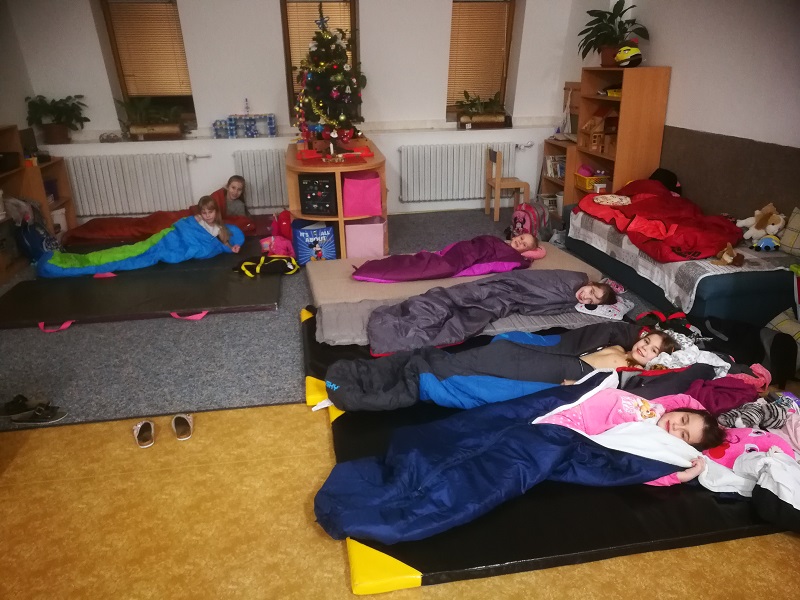 Po roce znovu nastal čas pro dobrodružnou noc dramatického kroužku. Ve škole jsme spali 24. 1. - 25. 1. 2020. Pro letošní rok nás bylo 19, bohužel některé mladé talenty skolila nemoc. Ke spánku jsme využili tři oddělení školní družiny. K občerstvení nám posloužila školní kuchyňka a ke hrám a zábavě jsme používali obě tělocvičny. Program byl velmi bohatý. Jeho hlavním cílem bylo trénování připravovaného představení a zdokonalování divadelních technik, součástí byl i vynikající workshop pod vedením Markéty Tiché s názvem – „Improvizace aneb vezmi chyby do hry“, který děti velmi zaujal a bavil. Mimo náročné trénování jsme se ale i hodně bavili, večer nás čekala noční stezka po škole, diskotéka a pohádka. Chtěli bychom pochválit všechny děti za jejich chování, za to, jak si navzájem dokázaly ve všem bez požádání pomáhat, za respektování všech dohodnutých pravidel a za to, že tu s námi byly. Za pomoc děkuji paní vychovatelce Dostálové i rodičům dětí.