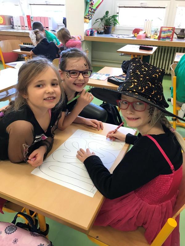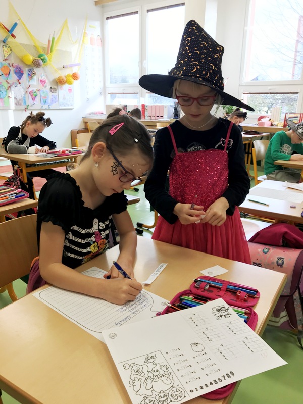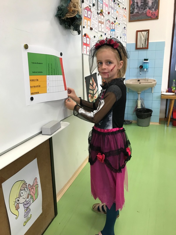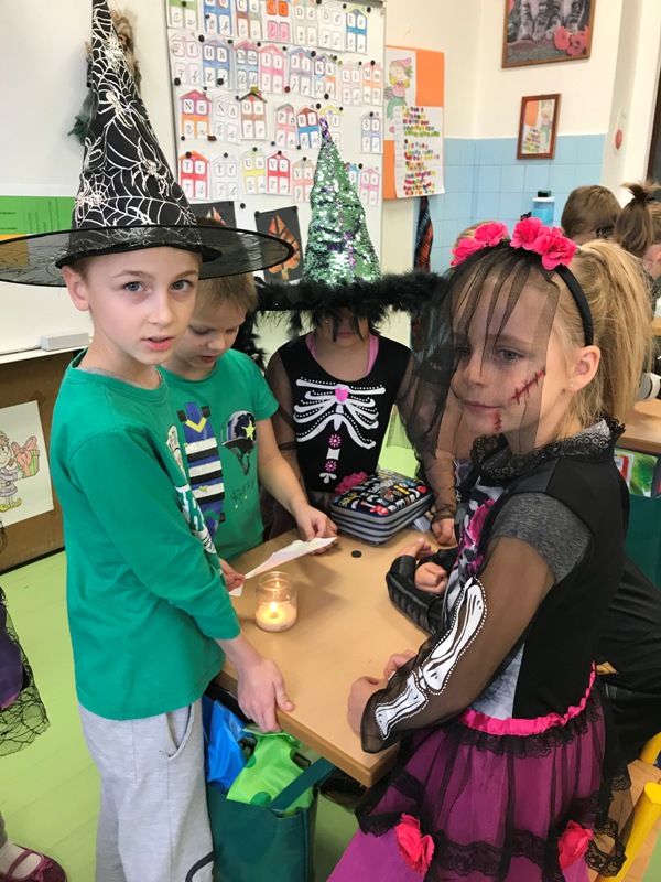 Ve středu 6.11. 2019 jsme si připomněli anglosaský svátek Halloween. I my jsme se oblékli do strašidelných kostýmů a těšili jsme se do školy, co náš čeká. Nejprve jsme si vyprávěli o tomto svátku a jeho tradicích. Poté jsme se přenesli do školy čar a kouzel, rozdělili jsme se do strašidelných týmů a utkali jsme se v kouzelnických disciplínách. Přečetli jsme si vzkaz tajným písmem, uvařili lektvar z čarodějných ingrediencí, spočítali tajemné matematické příklady, museli jsme přečíst ochranná zaklínadla proti strašidlům. Na závěr jsme se utkali ve sportovním minizávodu. Čarodějné učení nás moc bavilo a budeme mít