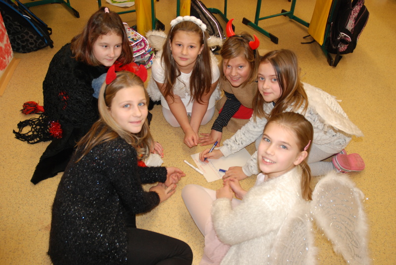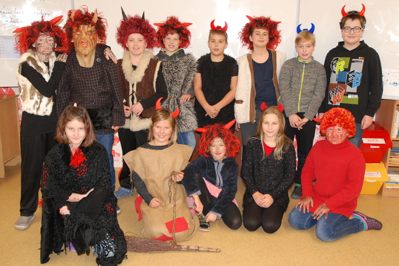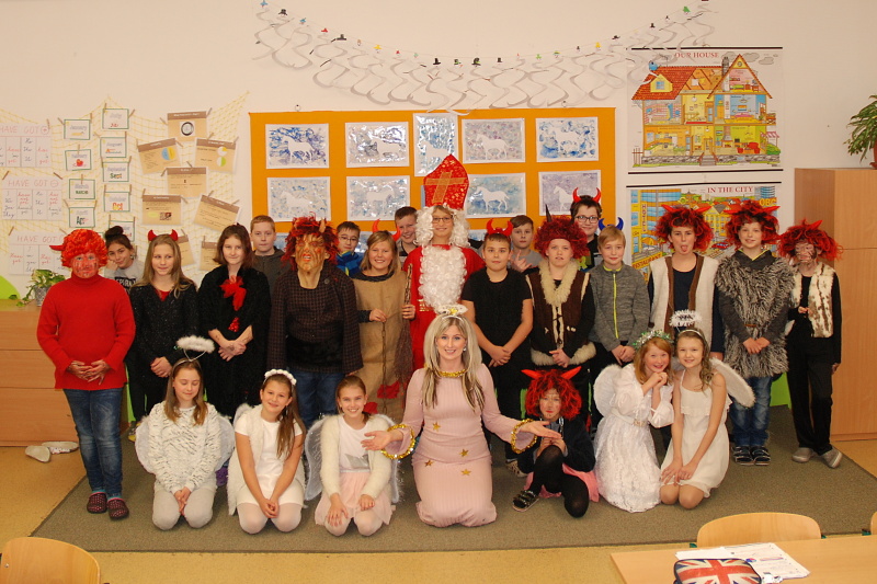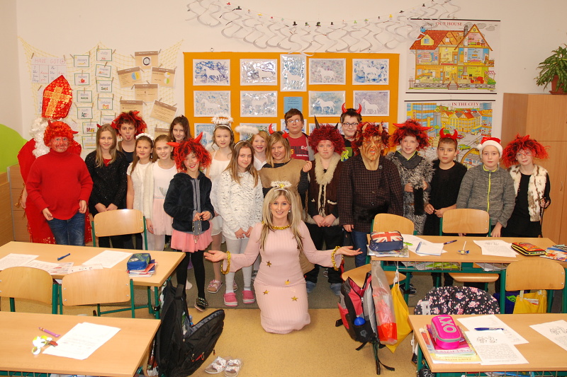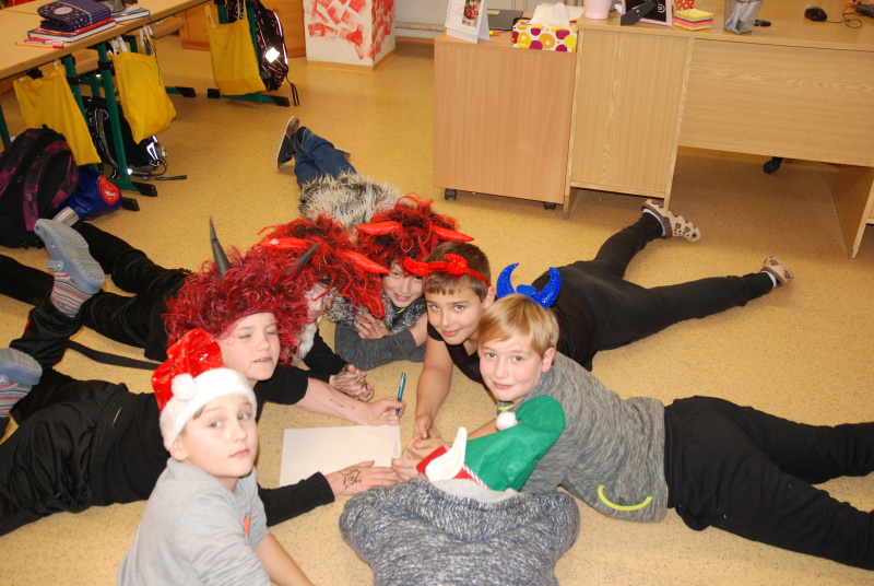 „Mikuláši, Mikuláši, kdo to tady děti straší?“… přeci děti z V. C! 5. prosince 2017 přišly totiž přestrojeni nejen v kostýmech čertů, ale také hodných a krásných andělů a moudrého a spravedlivého Mikuláše. V tento den proběhlo v jejich třídě projektové vyučování „Mikulášování“. V českém jazyce plnily nelehké úkoly s Andělkou a čertem Feferonem. Matematika byla ryze pekelného charakteru: žáci zjišťovali, kolik utratil Lucifer za nové pytle, kolik rohatých spí v jednom kotli nebo také hledali chybějící čísla v čertovském řetězu. Ve čtení pak četli několik ukázek Mikulášských pohádek z per jejich vrstevníků a sami si pak ve skupinách zkusili napsat „Čertovskou pohádku“. Při jejich čtení jsme se moc nasmáli. Na závěr si namalovali portréty Mikuláše, anděla nebo čerta, které nám zdobí nástěnku a připomínají tak nevšední a povedený školní den.