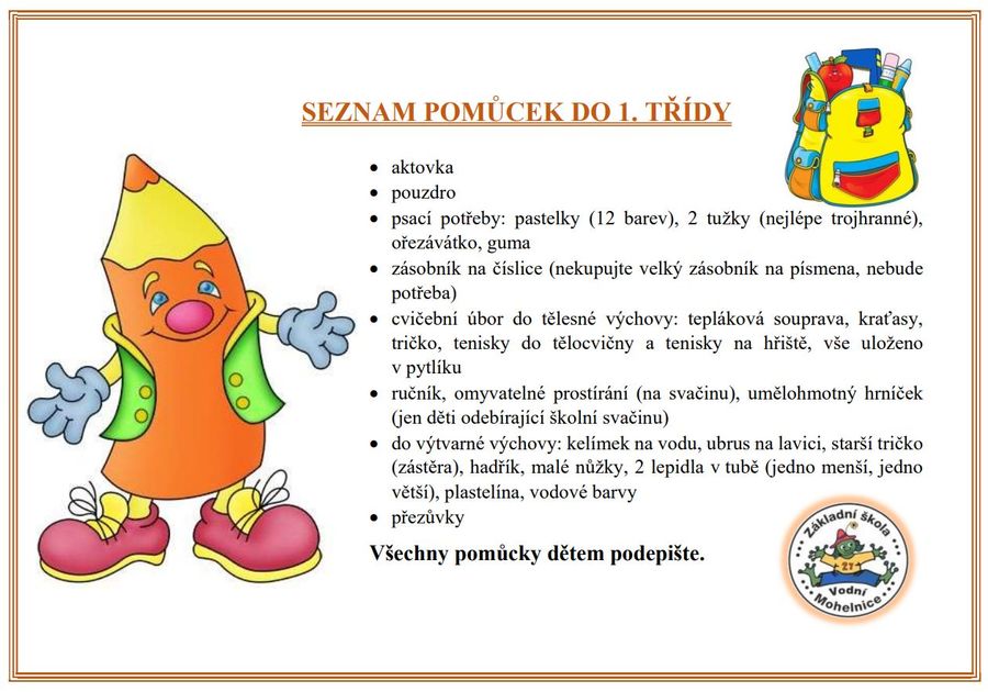 níže naleznete seznam potřebných pomůcek do 1. třídy pro nový školní rok 2022/2023. Seznam pomůcek si můžete stáhnout zde