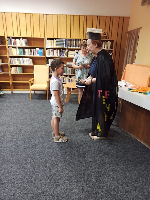 Paní učitelka připravila pro své prvňáčky přípravnou školu v přírodě na jednu noc na Bozeňově u Krobotů. První zastávka byla v knihovně, kde víla Knihomilka pasovala všechny žáky na čtenáře.