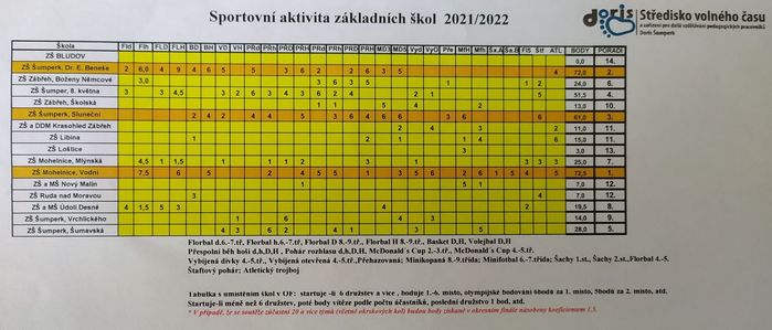 Po pauze způsobené onemocněním Covid-19 se v uplynulém školním roce opět naplno rozběhly sportovní soutěže pro základní školy šumperského okresu. Naše škola se sice nezúčastnila všech soutěží, které byly pro školní rok vyhlášeny, i tak ale výbornými výkony zejména v atletice, míčových hrách a florbalu nakonec dosáhla na první místo. Velmi si tohoto umístění považujeme, protože se nestává často, abychom v konkurenci zejména sportovních škol ze Šumperka stanuli na nejvyšší příčce.